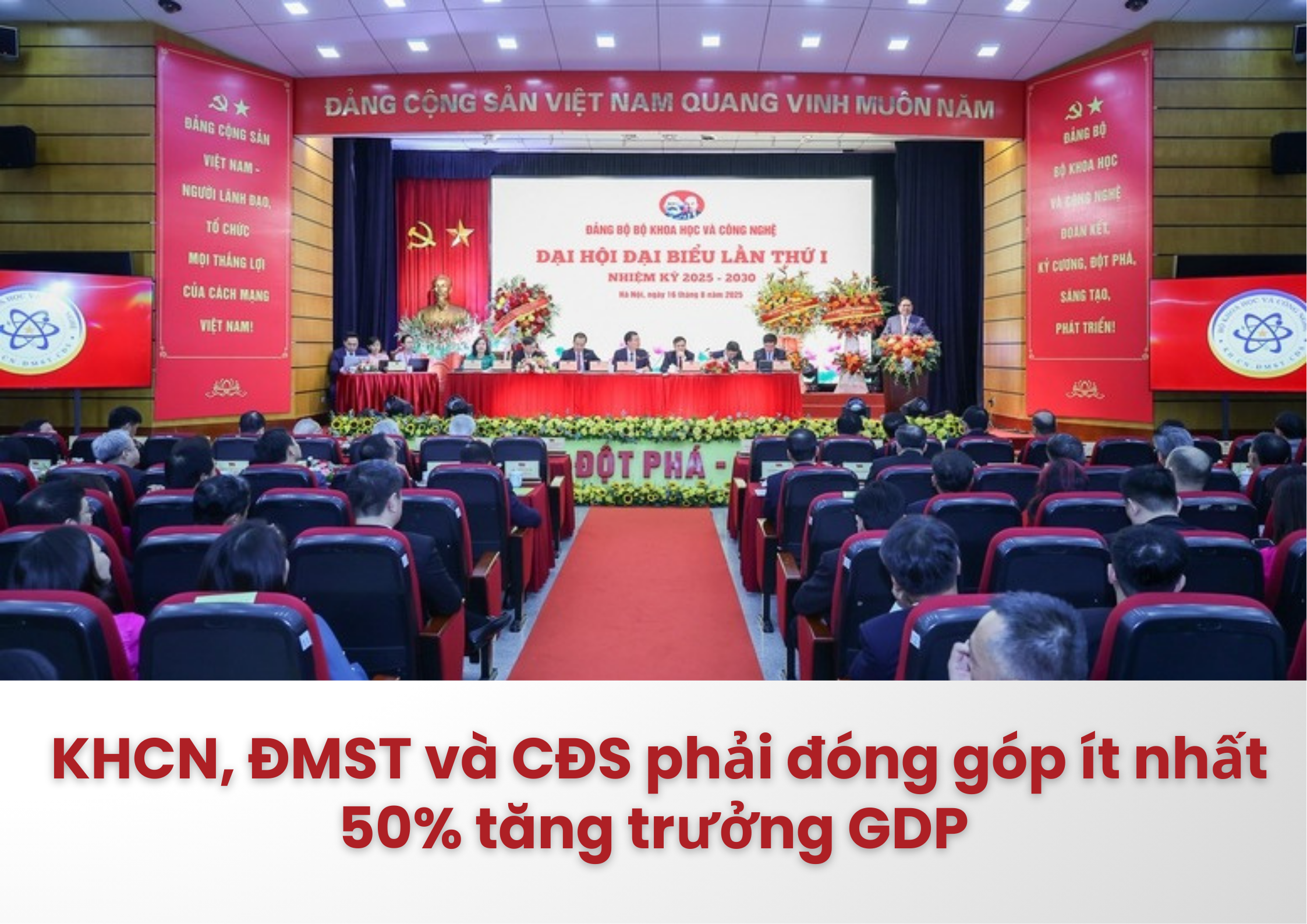 Đại hội Đại biểu lần thứ I Đảng bộ Bộ Khoa học và Công nghệ nhiệm kỳ 2025-2030 xác định các yêu cầu và mục tiêu trọng tâm đối với khoa học, công nghệ, đổi mới sáng tạo và chuyển đổi số trong giai đoạn tới. Các nội dung được nêu tại Đại hội nhấn mạnh việc gắn kết ba trụ cột chiến lược, phát huy sức mạnh cộng hưởng sau hợp nhất, tập trung giải quyết các bài toán chiến lược quốc gia và triển khai các mục tiêu cụ thể về đóng góp GDP, phát triển kinh tế số, hạ tầng số, nguồn nhân lực, tiêu chuẩn hóa, sở hữu trí tuệ và năng lượng nguyên tử.