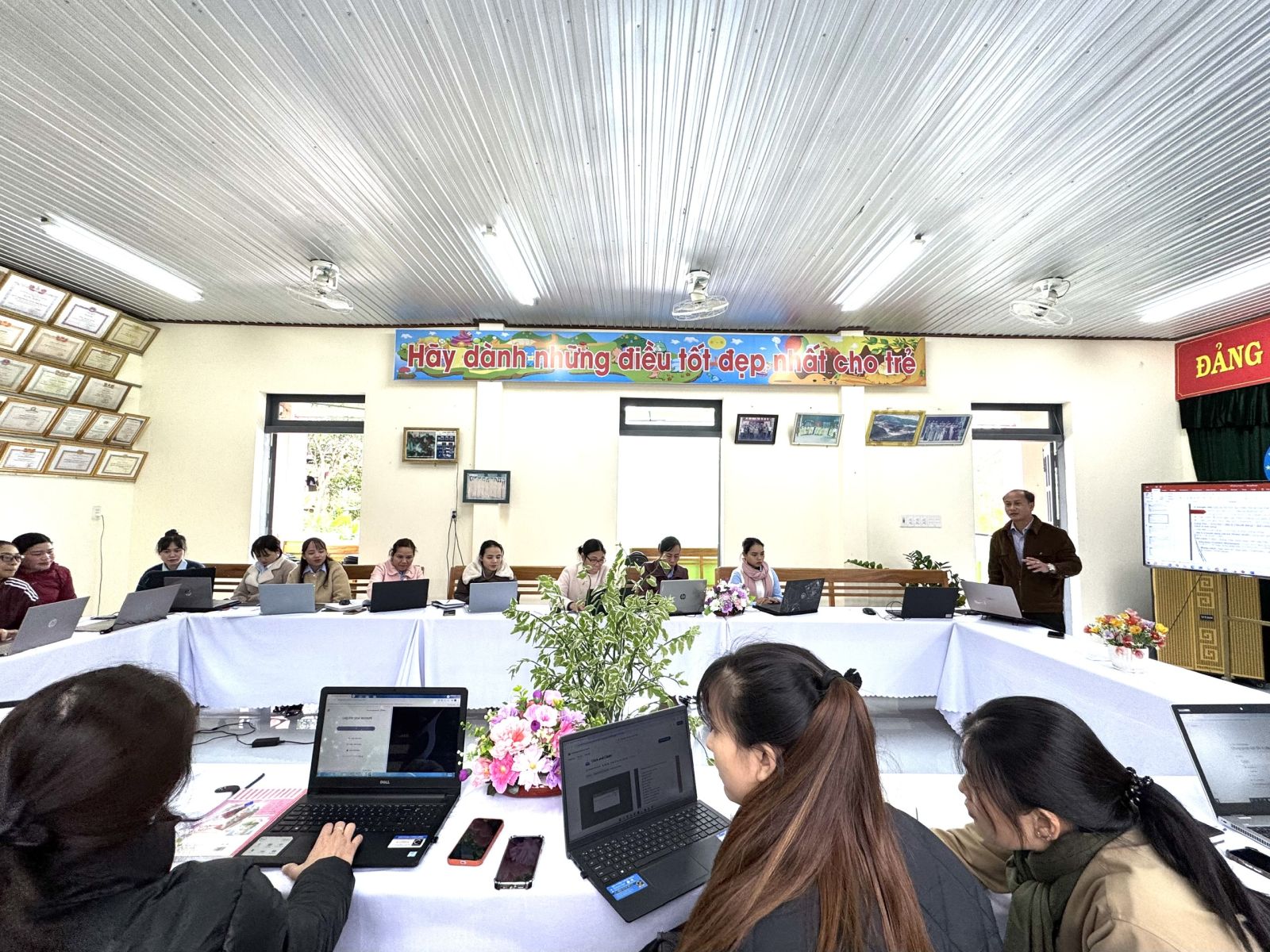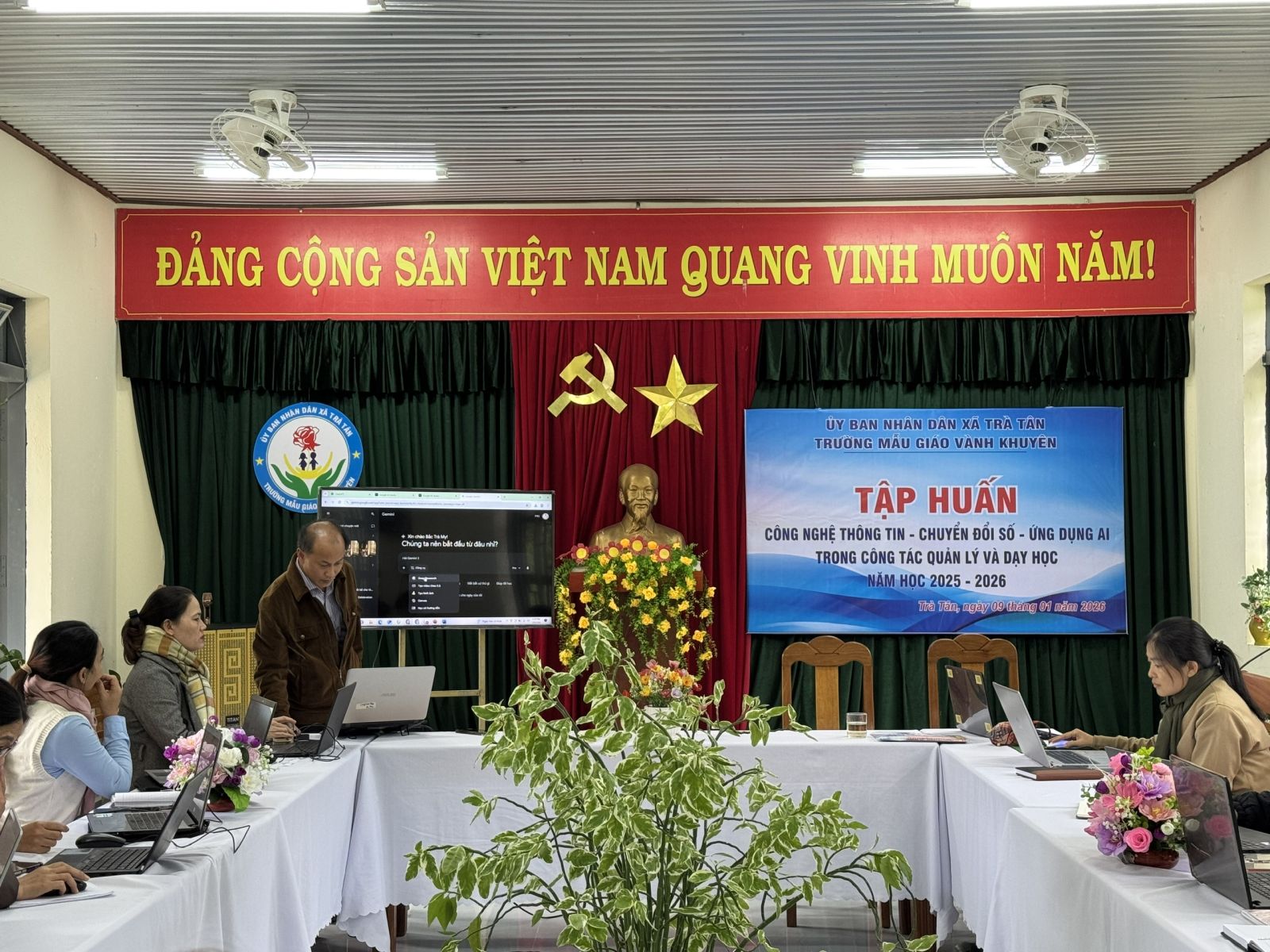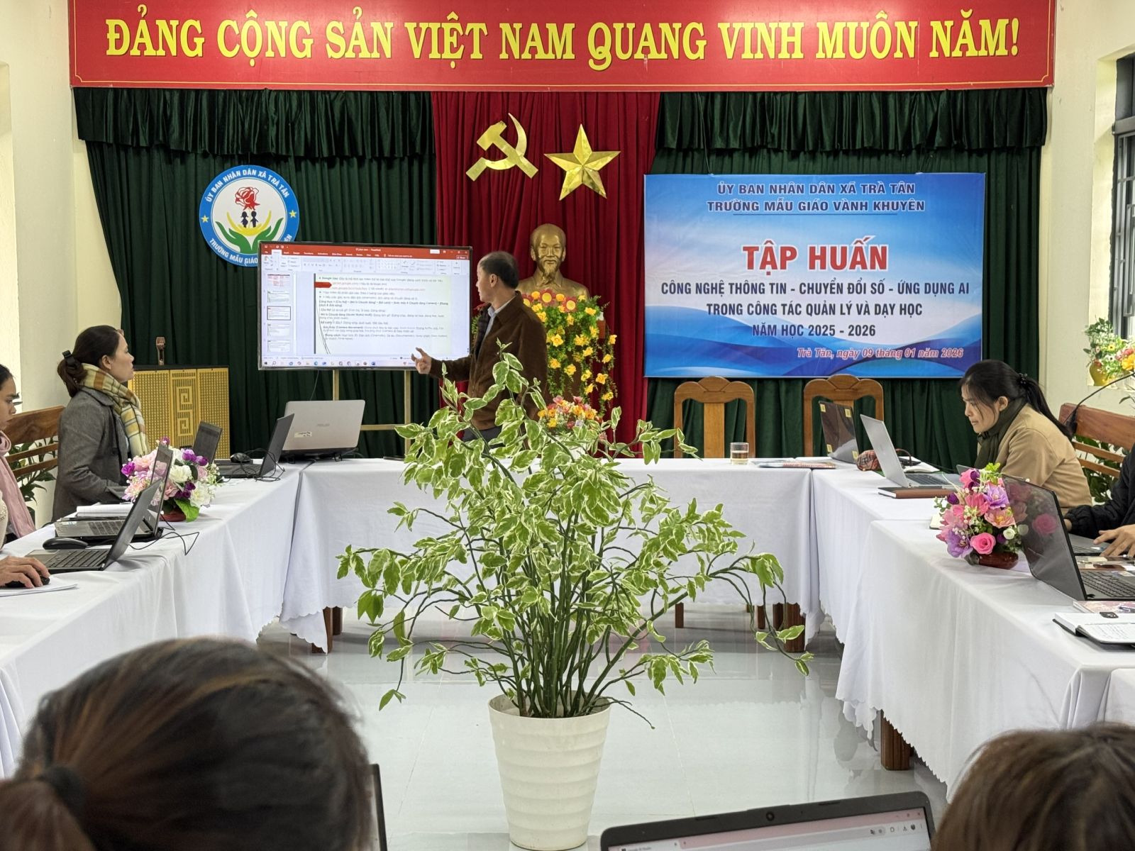 Chiều ngày 09 tháng 01 năm 2026, Trường Mẫu giáo Vành Khuyên, xã Trà Tân, tổ chức tập huấn Công nghệ thông tin - Chuyển đổi số - Ứng dụng AI trong công tác quản lý và dạy học. Tham gia buổi tập huấn có 100% cán bộ quản lý, giáo viên của nhà trường. Đặc biệt nhà trường có mời đồng chí Nguyễn Thanh Tú - Phó chủ tịch UBND xã Trà Tân: Báo cáo viên cho buổi tập huấn.