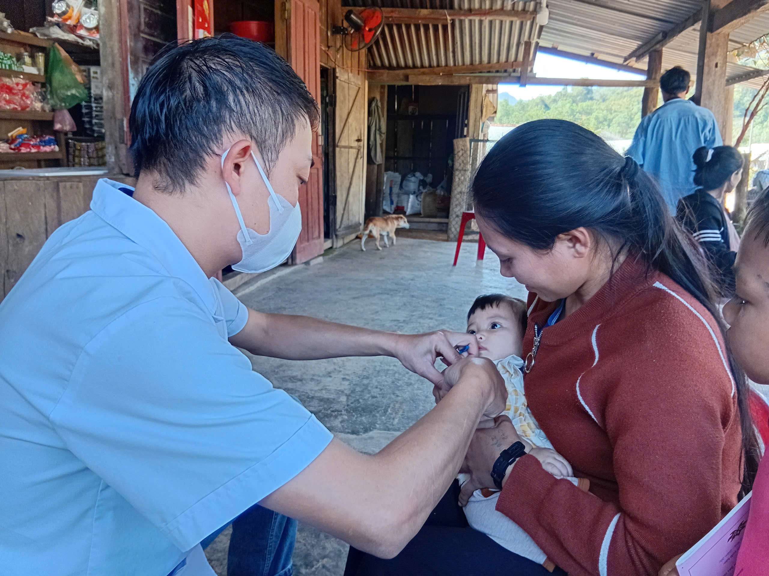 Cán bộ y tế xã hướng dẫn và hỗ trợ phụ huynh cho trẻ uống vi chất dinh dưỡng trong đợt triển khai chương trình.