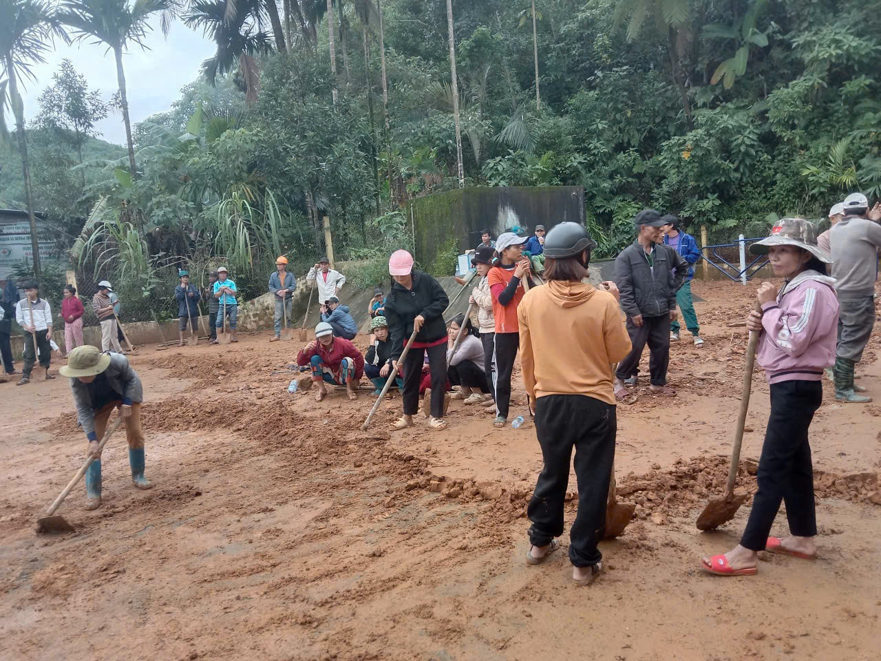 Hội viên phụ nữ và người dân xã Trà Tân tham gia dọn dẹp, san gạt bùn đất trên tuyến đường bị ảnh hưởng sau mưa lũ trong hoạt động “Ngày Chủ nhật xanh”.